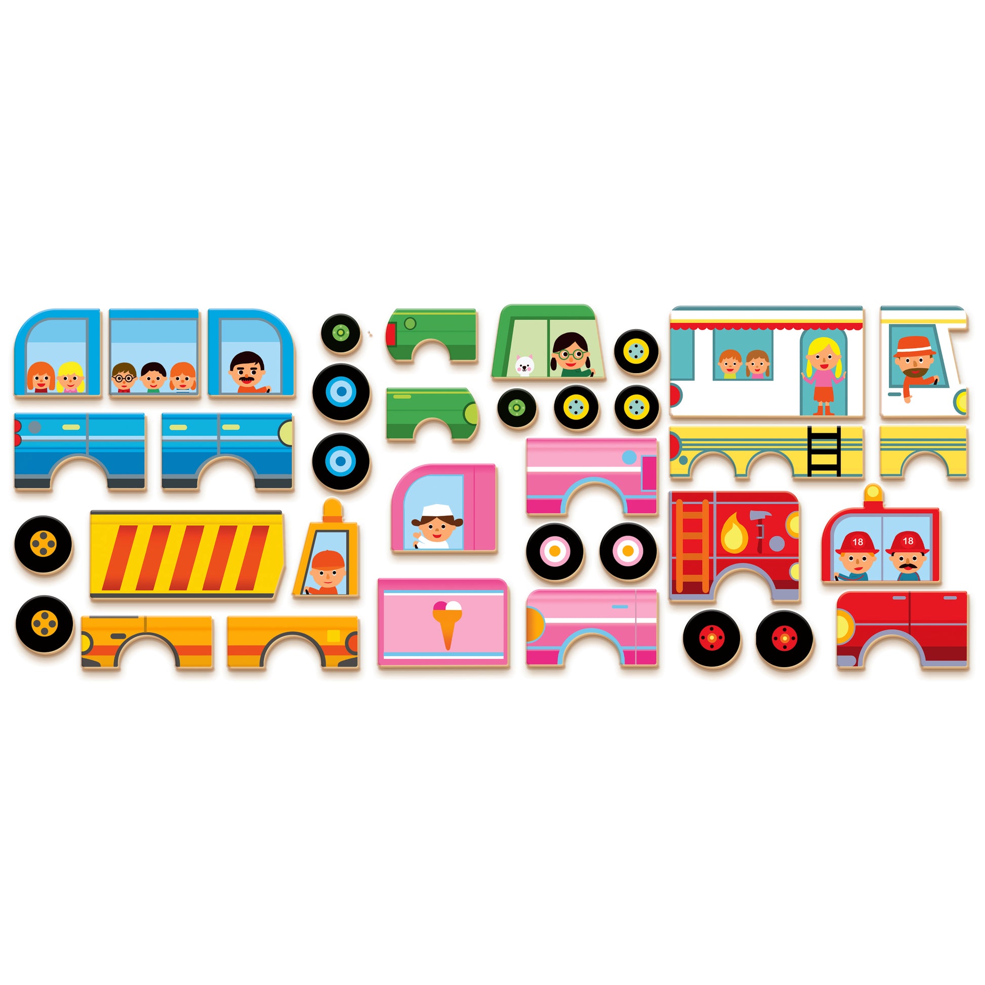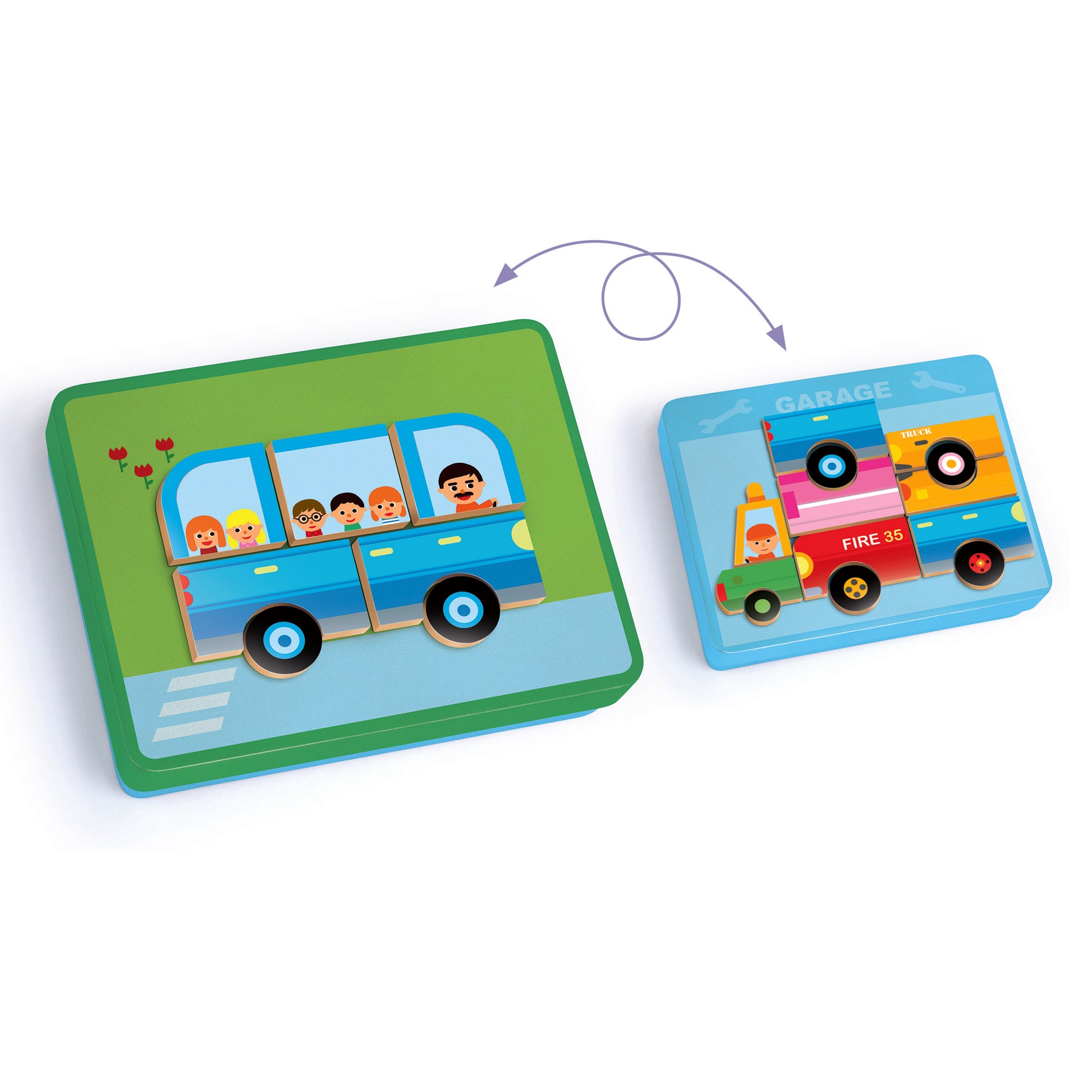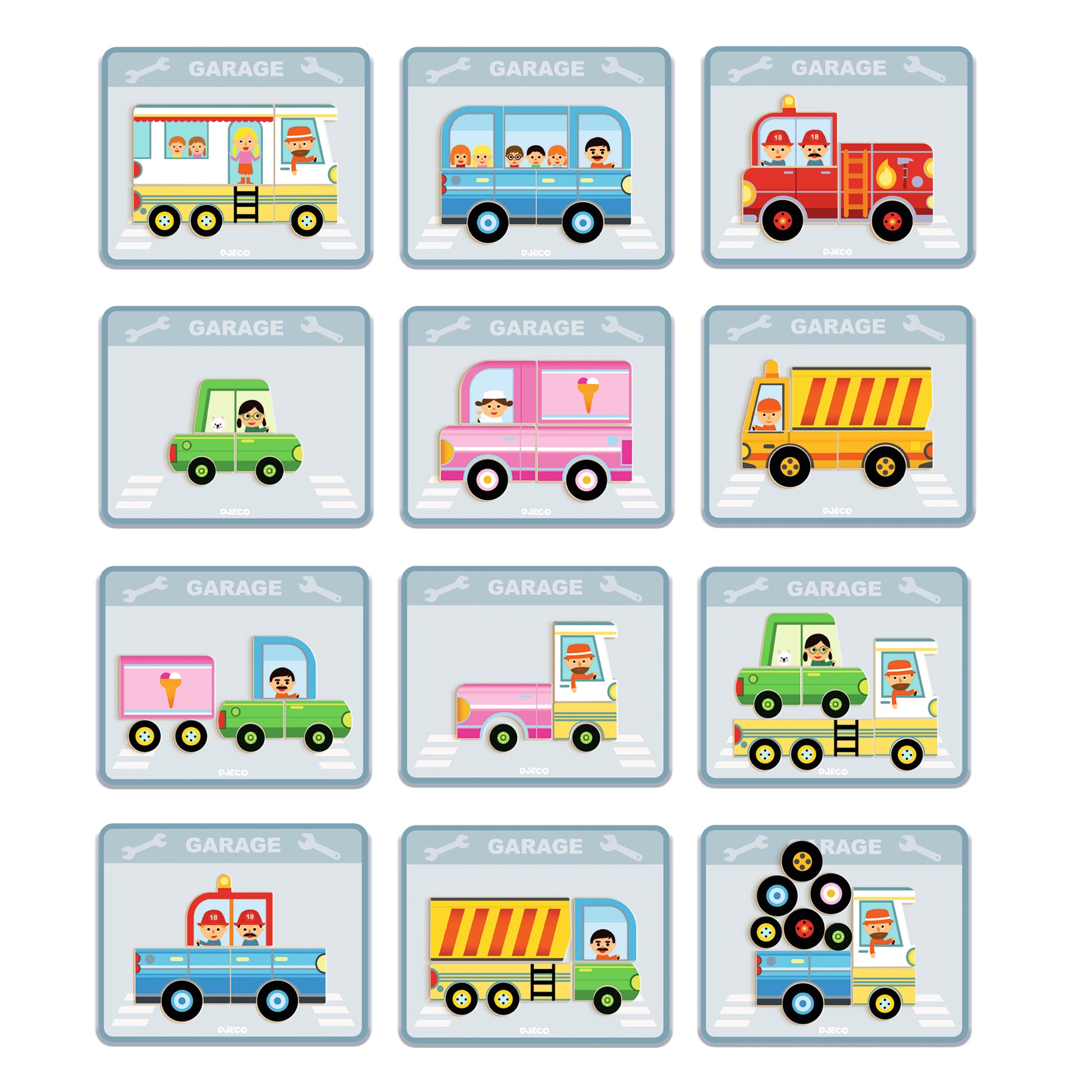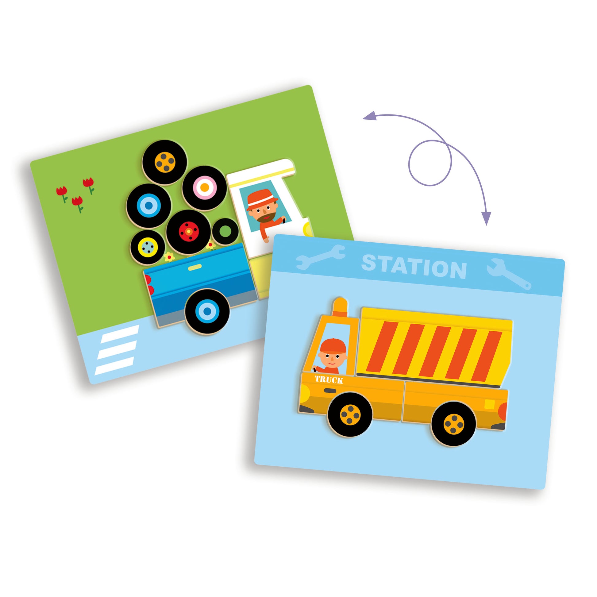 Il reproduit les 12 véhicules représentés sur les cartes en choisissant le bon côté de la boîte.